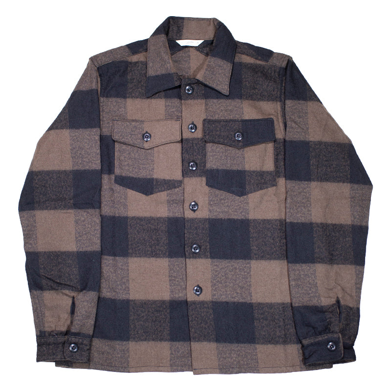 The Fatigue Overshirt is in a true classic military style. The shirt is made from a unique boiled wool/cotton blend with a brown and black buffalo check.
