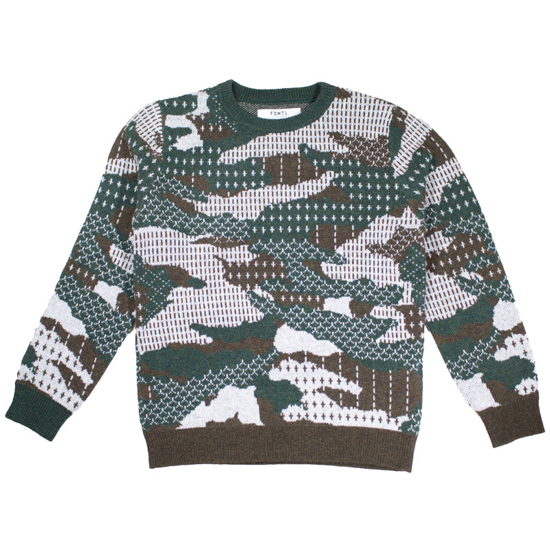 A sweater that expresses the original camouflage sashiko pattern using high-quality wool.
