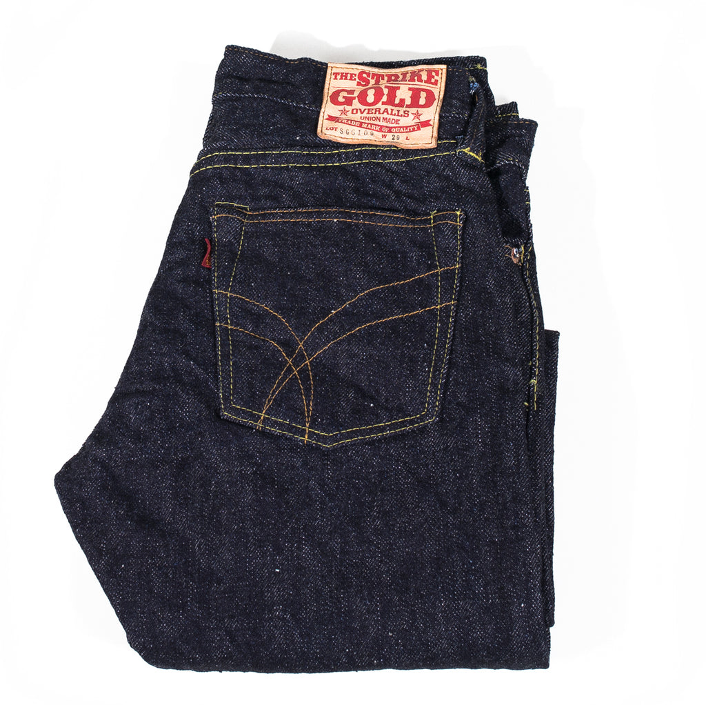 The Strike Gold 6109 is a 16.5oz denim made of pure indigo warp threads and a natural weft thread. The 6109 is called 'super slubby' as it has an extremely uneven texture and a slubby looking nep that has not been seen before. These jeans will fade quickly with a high contrast due to the materials and the process in which they were made. The Strike Gold is known for their attention to details and they make no exception with this pair. Every button, rivet and stitch is impeccably finished.