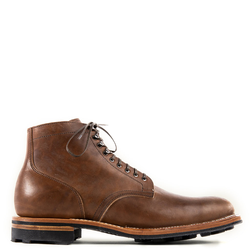 This Viberg Service Boot utilizes a medium brown Horsebutt with olive undertones which features variation in color, tone, and a unique grain. These natural discrepancies will wear with a large amount of character over time. The end result is a patina that will be unique to every pair.