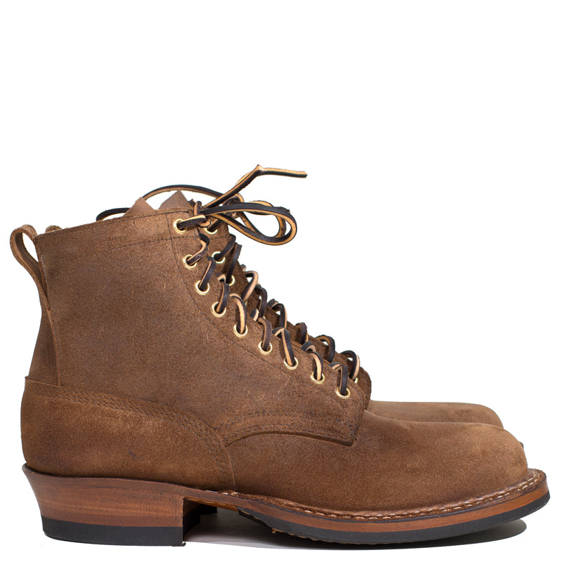 This brown distressed rough-out Smoke Jumper is an all-world beater, one that is destined to be worn to the ground. We love the Smoke Jumper pattern for it's unique and versatile style, one that would fit in on the trails or on the streets. This pair is available in any size and any width so please message us for any sizing help.