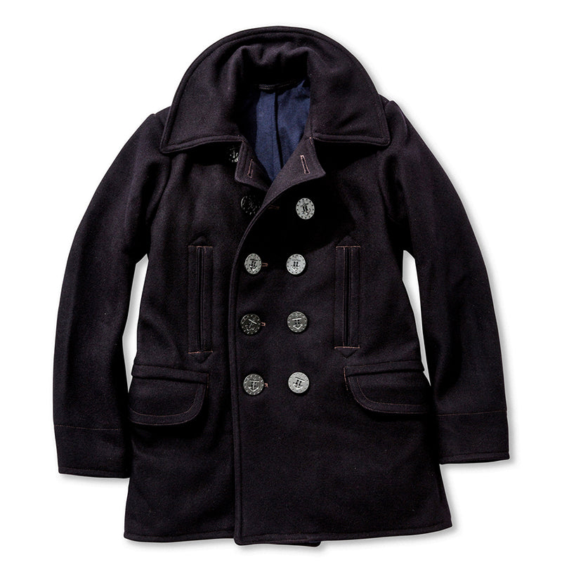 A reproduction of a 1913 issue Pea Coat by the US Navy. As of that time, the 13 star button was reproduced with ebonite. Although it is a kind of rubber, ebonite is strong enough to be used as a bowling ball. Paired with the double cross melton wool you have a heavy duty peacoat that is sure to keep you warm for years to come.